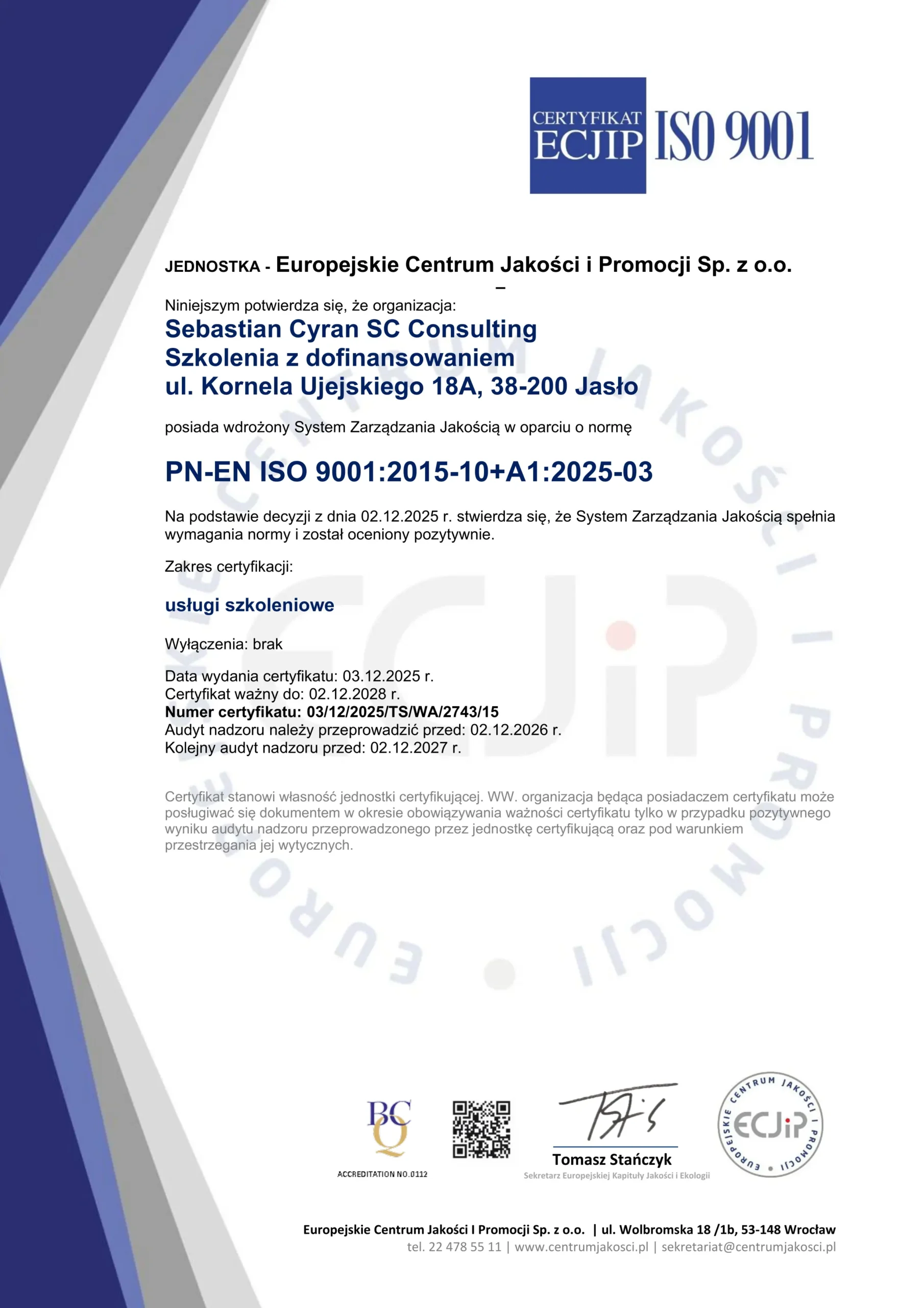 Wieloletni dyrektor zarządzający i członek zarządu spółek, odpowiedzialny za budowę procesów, rozwój zespołów, wdrażanie standardów jakości oraz projektowanie usług szkoleniowych. Od 2017 r. właściciel SC Consulting – firmy szkoleniowej posiadającej certyfikację PN-EN ISO 9001:2015+A1:2025, gwarantującą zgodność procesów z międzynarodowymi standardami jakości.